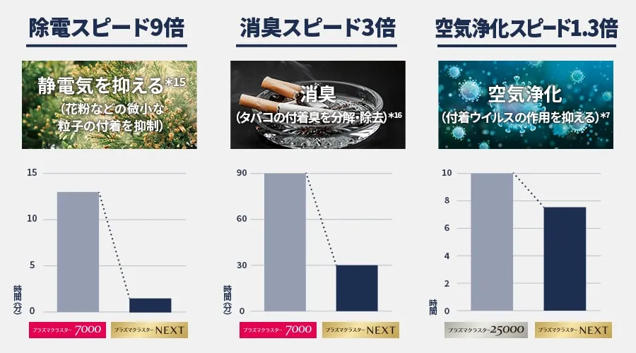 プラズマクラスター7000⇒プラズマクラスター25000⇒プラズマクラスターNEXTとプラズマクラスターの濃度が上がれば効果もスピードも上がります。