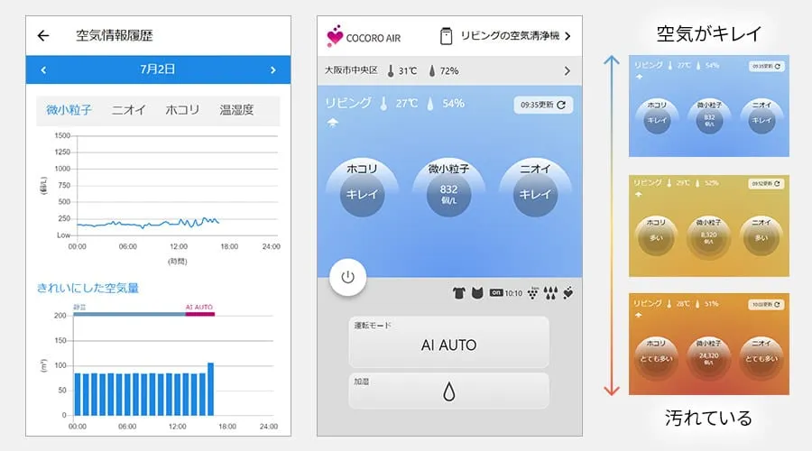 - アプリで温度・湿度・空気の汚れ具合をひと目で把握できる。